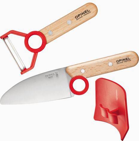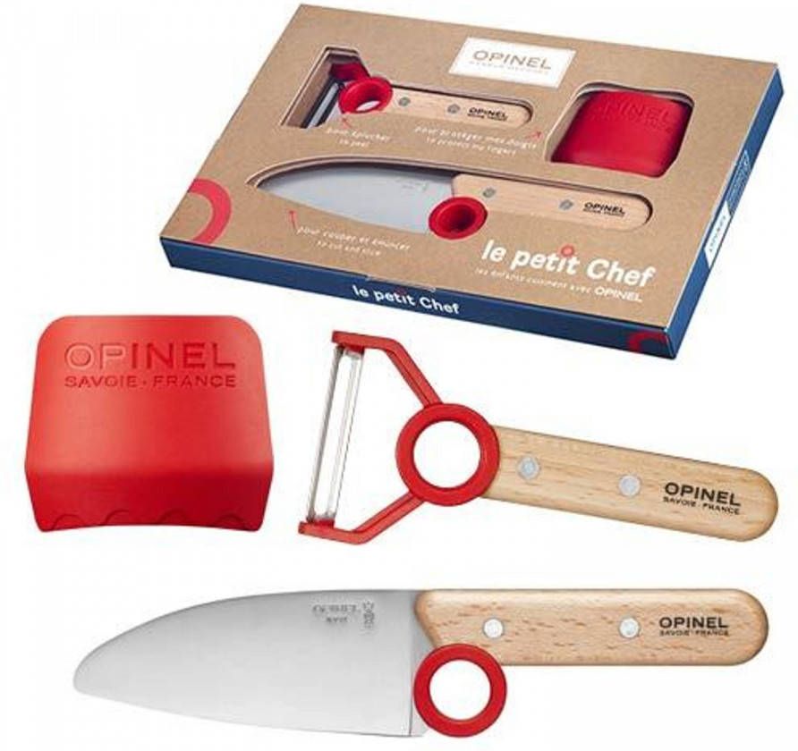 Messenset Le Petit Chef, 3-delig, van Opinel. Leuke keukenset voor kinderen met een koksmes, dunschiller en een vingerbeschermer. Het koksmes heeft een lemmet van hoogwaardig roestvrij staal met afgeronde punt. Het heft is van hout en voo.