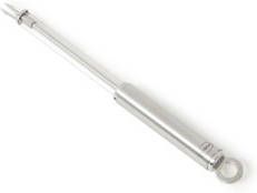 Kaassnijder van het merk Rösle- De twee staaldraden lopen langs de kanten van de kaassnijder, elke draad op verschillende afstand van het middenstuk zodat zachte kazen in verschillende diktes gesneden kunnen worden- De snijder is vaatwasmachinebestendig en is voorzien van een ophangoog-.